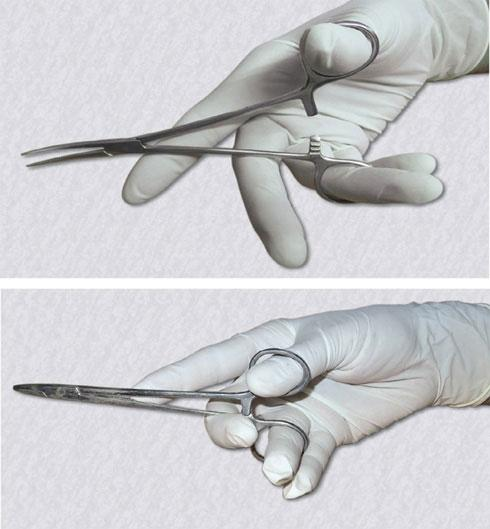 - Hands holding locking forceps showing ratchet release