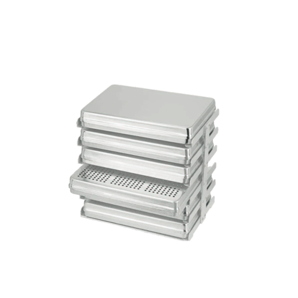 The rack keeps trays organized, minimizing the risk of misplaced instruments and ensuring quick access during procedures.