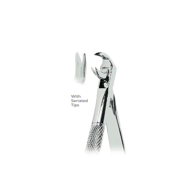 High-quality universal extracting forceps with serrated tips for lower molars and premolars.